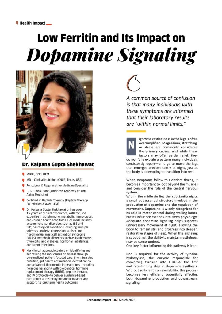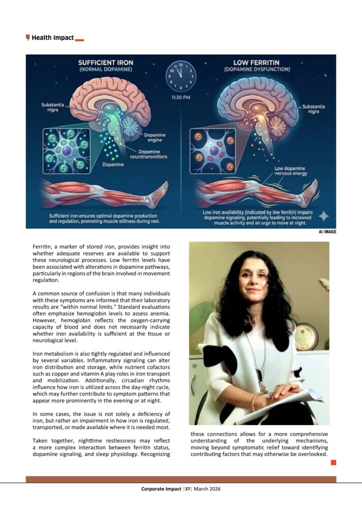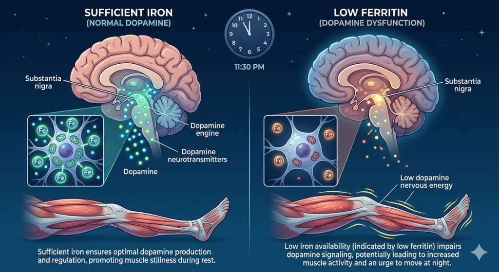 Taken together, nighttime restlessness may reflect a more complex interaction between ferritin status, dopamine signaling, and sleep physiology. Recognizing these connections allows for a more comprehensive understanding of the underlying mechanisms, moving beyond symptomatic relief toward identifying contributing factors that may otherwise be overlooked.
