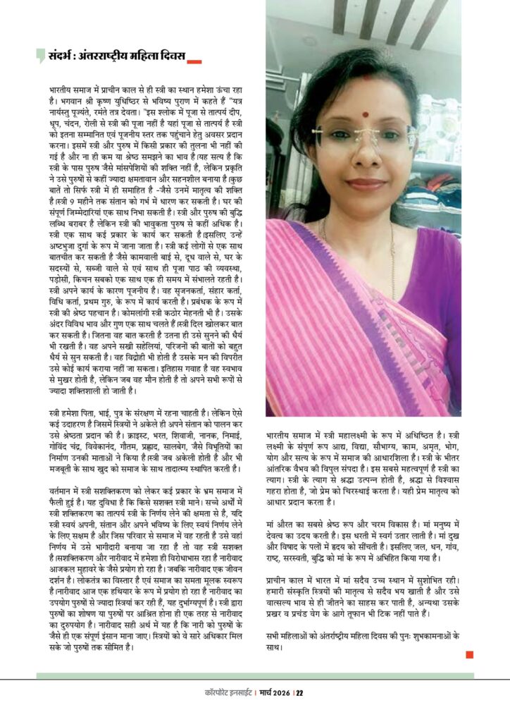 भारतीय समाज में प्राचीन काल से ही स्त्री का स्थान हमेशा ऊंचा रहा है। भगवान श्री कृष्ण युधिष्ठिर से भविष्य पुराण में कहते हैं “यत्र नार्यस्तु पूज्यंते, रमंते तत्र देवता। ”इस श्लोक में पूजा से तात्पर्य दीप, धूप, चंदन, रोली से स्त्री की पूजा नहीं है यहां पूजा से तात्पर्य है स्त्री को इतना सम्मानित एवं पूजनीय स्तर तक पहुंचाने हेतु अवसर प्रदान करना। इसमें स्त्री और पुरुष में किसी प्रकार की तुलना भी नहीं की गई है और ना ही कम या श्रेष्ठ समझने का भाव है।यह सत्य है कि स्त्री के पास पुरुष जैसे मांसपेशियों की शक्ति नहीं है, लेकिन प्रकृति ने उसे पुरुषों से कहीं ज्यादा क्षमतावान और सहनशील बनाया है।कुछ बातें तो सिर्फ स्त्री में ही समाहित है -जैसे उनमें मातृत्व की शक्ति है।स्त्री 9 महीने तक संतान को गर्भ में धारण कर सकती है। घर की संपूर्ण जिम्मेदारियां एक साथ निभा सकती है। स्त्री और पुरुष की बुद्धि लब्धि बराबर है लेकिन स्त्री की भावुकता पुरुष से कहीं अधिक है। स्त्री एक साथ कई प्रकार के कार्य कर सकती है।इसलिए उन्हें अष्टभुजा दुर्गा के रूप में जाना जाता है। स्त्री कई लोगों से एक साथ बातचीत कर सकती है जैसे कामवाली बाई से, दूध वाले से, घर के सदस्यों से, सब्जी वाले से एवं साथ ही पूजा पाठ की व्यवस्था, पड़ोसी, किचन सबको एक साथ एक ही समय में संभालते रहती है। स्त्री अपने कार्य के कारण पूजनीय है। वह सृजनकर्ता, संहार कर्ता, विधि कर्ता, प्रथम गुरु, के रूप में कार्य करती है। प्रबंधक के रूप में स्त्री की श्रेष्ठ पहचान है। कोमलांगी स्त्री कठोर मेहनती भी है। उसके अंदर विविध भाव और गुण एक साथ चलते हैं।स्त्री दिल खोलकर बात कर सकती है। जितना वह बात करती है उतना ही उसे सुनने की धैर्य भी रखती है। वह अपने सखी सहेलियां, परिजनों की बातों को बहुत धैर्य से सुन सकती है। वह विद्रोही भी होती है उसके मन की विपरीत उसे कोई कार्य कराया नहीं जा सकता। इतिहास गवाह है वह स्वभाव से मुखर होती है, लेकिन जब वह मौन होती है तो अपने सभी रूपों से ज्यादा शक्तिशाली हो जाती है।