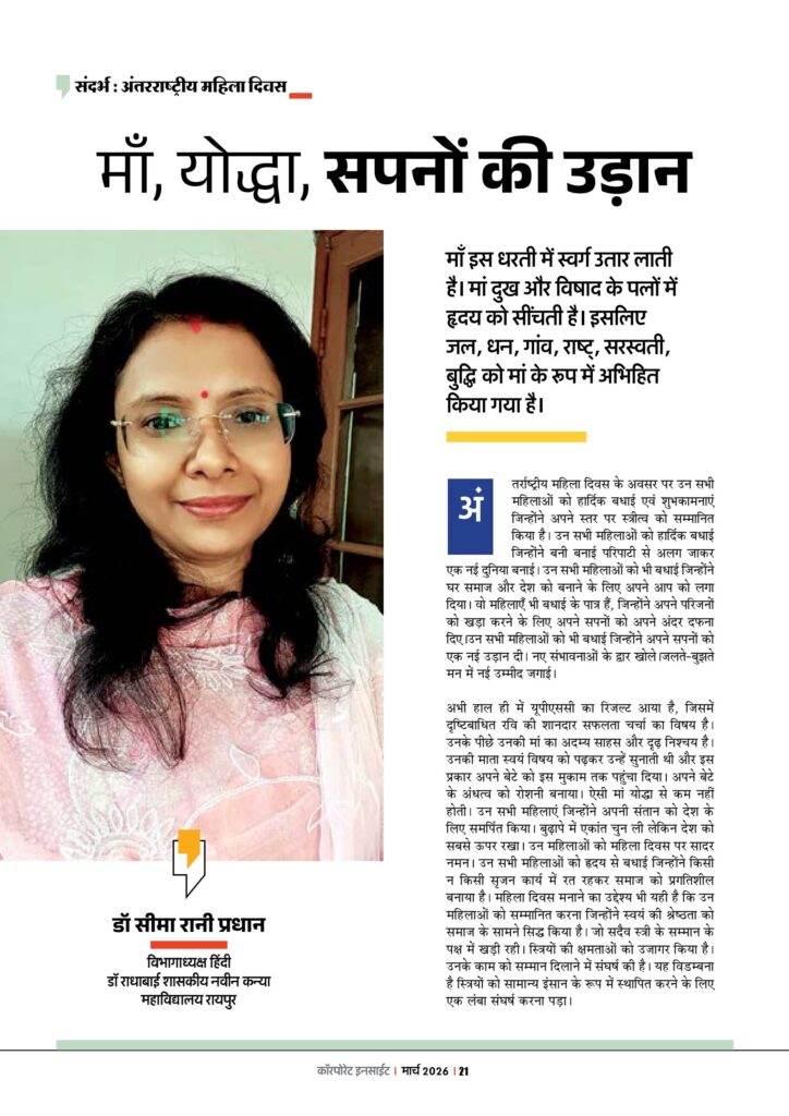 अभी हाल ही में यूपीएससी का रिजल्ट आया है, जिसमें दृष्टिबाधित रवि की शानदार सफलता चर्चा का विषय है। उनके पीछे उनकी मां का अदम्य साहस और दृढ़ निश्चय है। उनकी माता स्वयं विषय को पढ़कर उन्हें सुनाती थी और इस प्रकार अपने बेटे को इस मुकाम तक पहुंचा दिया। अपने बेटे के अंधत्व को रोशनी बनाया। ऐसी मां योद्धा से कम नहीं होती। उन सभी महिलाएं जिन्होंने अपनी संतान को देश के लिए समर्पित किया। बुढ़ापे में एकांत चुन ली लेकिन देश को सबसे ऊपर रखा। उन महिलाओं को महिला दिवस पर सादर नमन। उन सभी महिलाओं को हृदय से बधाई जिन्होंने किसी न किसी सृजन कार्य में रत रहकर समाज को प्रगतिशील बनाया है। महिला दिवस मनाने का उद्देश्य भी यही है कि उन महिलाओं को सम्मानित करना जिन्होंने स्वयं की श्रेष्ठता को समाज के सामने सिद्ध किया है। जो सदैव स्त्री के सम्मान के पक्ष में खड़ी रही। स्त्रियों की क्षमताओं को उजागर किया है। उनके काम को सम्मान दिलाने में संघर्ष की है। यह विडम्बना है स्त्रियों को सामान्य इंसान के रूप में स्थापित करने के लिए एक लंबा संघर्ष करना पड़ा।