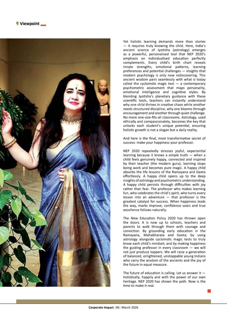 The New Education Policy 2020 has thrown open the doors. It is now up to schools, teachers and parents to walk through them with courage and conviction. By grounding early education in the Ramayana, Mahabharata and Geeta; by using astrology alongside cyclomstic magic tests to truly know each child’s mindset; and by making happiness the guiding professor in every classroom — we will not just produce toppers. We will raise a generation of balanced, enlightened, unstoppable young Indians who carry the wisdom of the ancients and the joy of the future in equal measure.