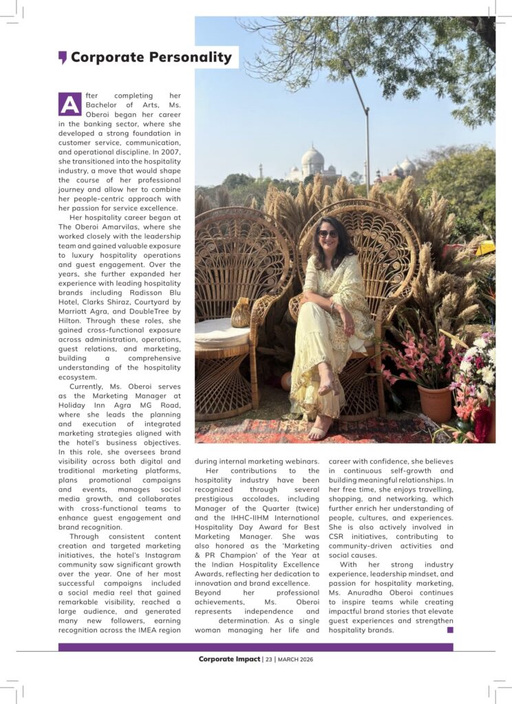 Currently, Ms. Oberoi serves as the Marketing Manager at Holiday Inn Agra MG Road, where she leads the planning and execution of integrated marketing strategies aligned with the hotel’s business objectives. In this role, she oversees brand visibility across both digital and traditional marketing platforms, plans promotional campaigns and events, manages social media growth, and collaborates with cross-functional teams to enhance guest engagement and brand recognition.